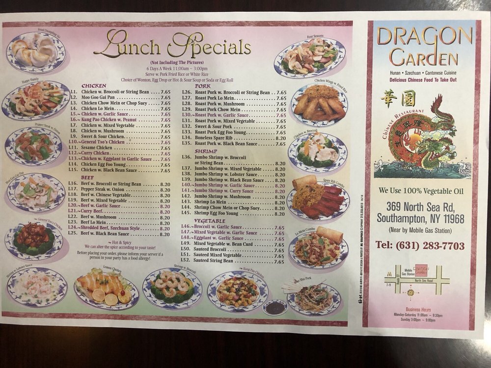 Dragon Garden, located in Southampton, NY, offers exceptional Chinese cuisine with a warm and friendly ambience. Customers rave about the delicious food, excellent portions, and authentic flavors. Reviewers praise the prompt service, attentive owner, and memorable dining experience. Highlights include the highly recommended chicken and garlic sauce, Singapore Mei Fun, and boneless rib combo. The family-owned business provides takeout and catering options, catering to a variety of dietary needs. With gender-neutral restrooms, wheelchair accessibility, and outdoor seating, Dragon Garden ensures all guests have a comfortable and enjoyable dining experience. Whether you're a regular or first-time visitor, Dragon Garden guarantees a satisfying meal with top-notch service.